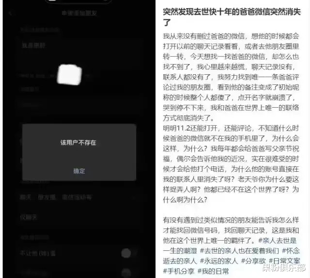 唯一留存的是一条父亲曾评论过的朋友圈动态,而父亲的昵称已变回系统默认名称。