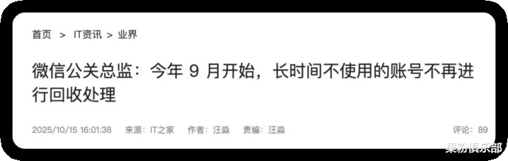 微信公关总监 @粥姨在 10 月 15 日的播客节目中透露,自 2025 年 9 月起,微信已正式调整账号回收策略。